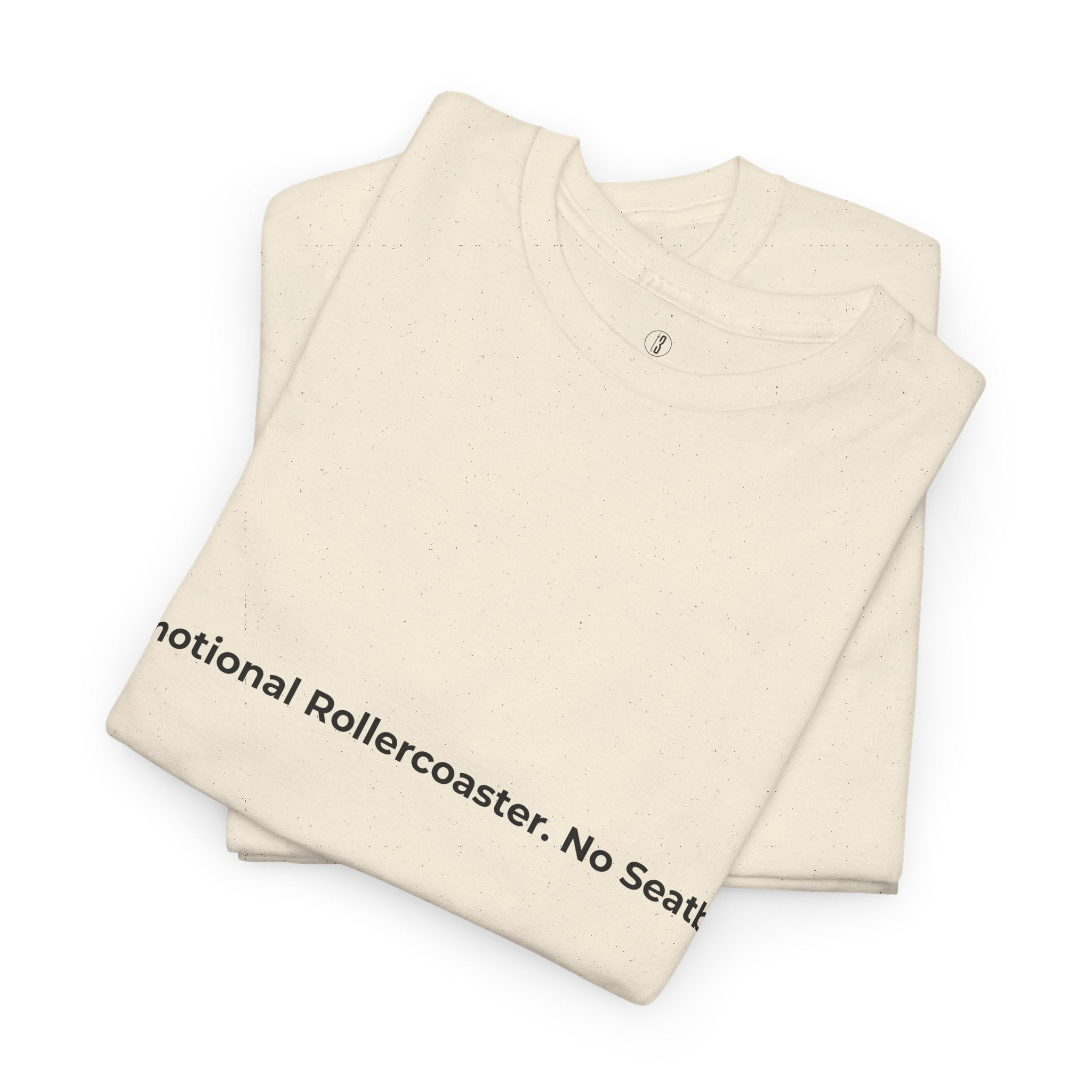 A beige short-sleeved t-shirt laid flat against a white background. Centered on the chest is the phrase “Emotional Rollercoaster. No Seatbelt.” printed in bold black text. The minimalist crew neck design pairs with the expressive message, capturing the raw, unfiltered energy of emotional intensity and the beauty of living without restraint
