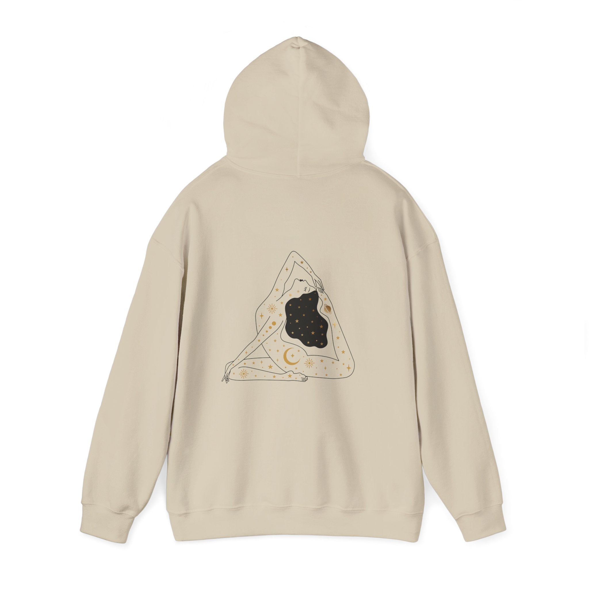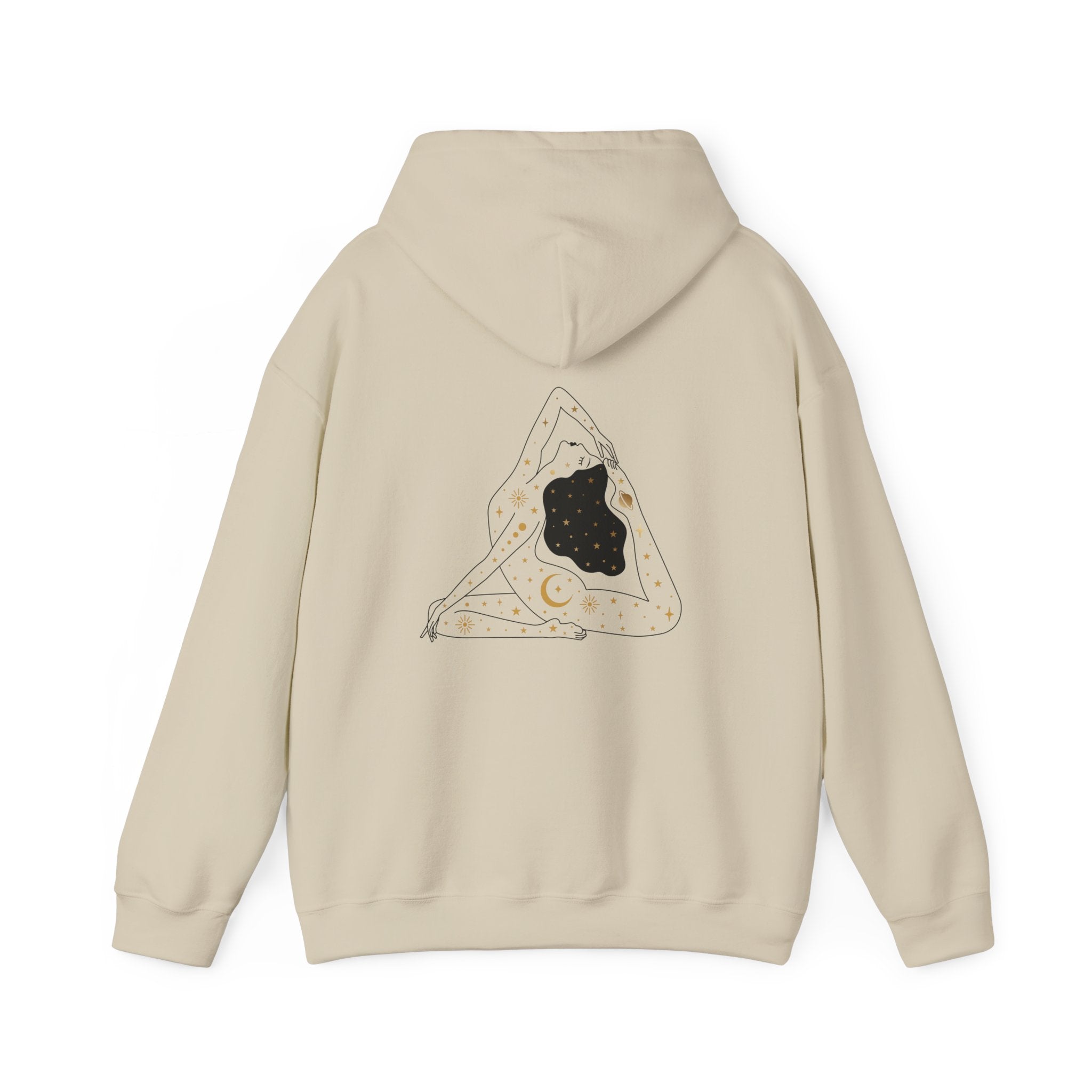 The minimalist chest print—“This Is Sacred”—is a gentle declaration, reminding you that softness, truth, and emotional clarity deserve reverence. Whether arriving in stillness, resting in solitude, or softening in public, this hoodie honors your truth. On the back, a celestial figure sits in quiet power—adorned with stars, moons, and sun-coded motifs. Their night-sky hair and golden accents evoke cosmic embodiment, ancestral wisdom, and the sacredness of being seen. This illustration is a sacred echo—softness isn’t for show, it’s a doorway to truth.
